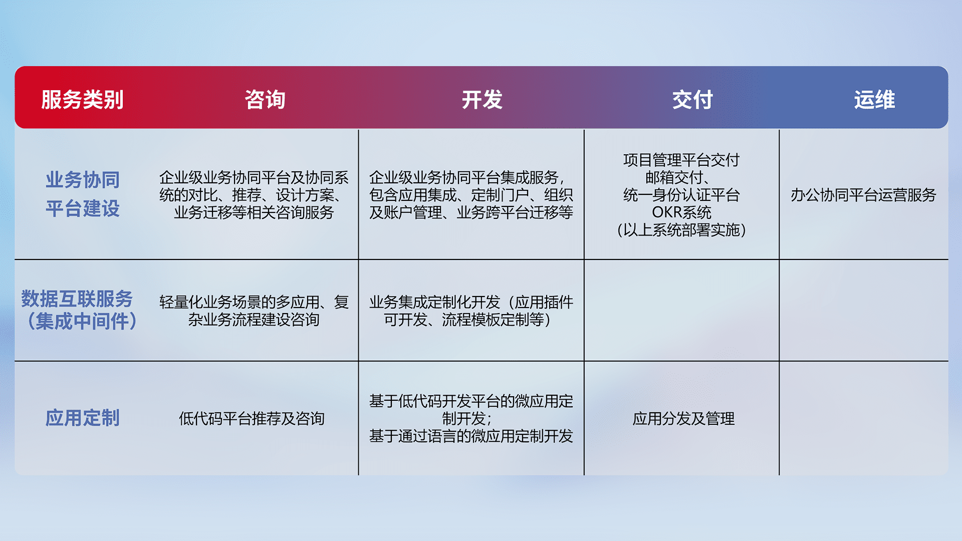 针对钉钉、、企微、、、、IDaas等平台级产品提供产品的规划、、、方案、、交付、、、定制化开发等服务,,,实现如统一协同办公、、、智能客户服务、、、混合会议管理、、、智能数据查询、、、、等业务场景,,实现数字化转型。。。。